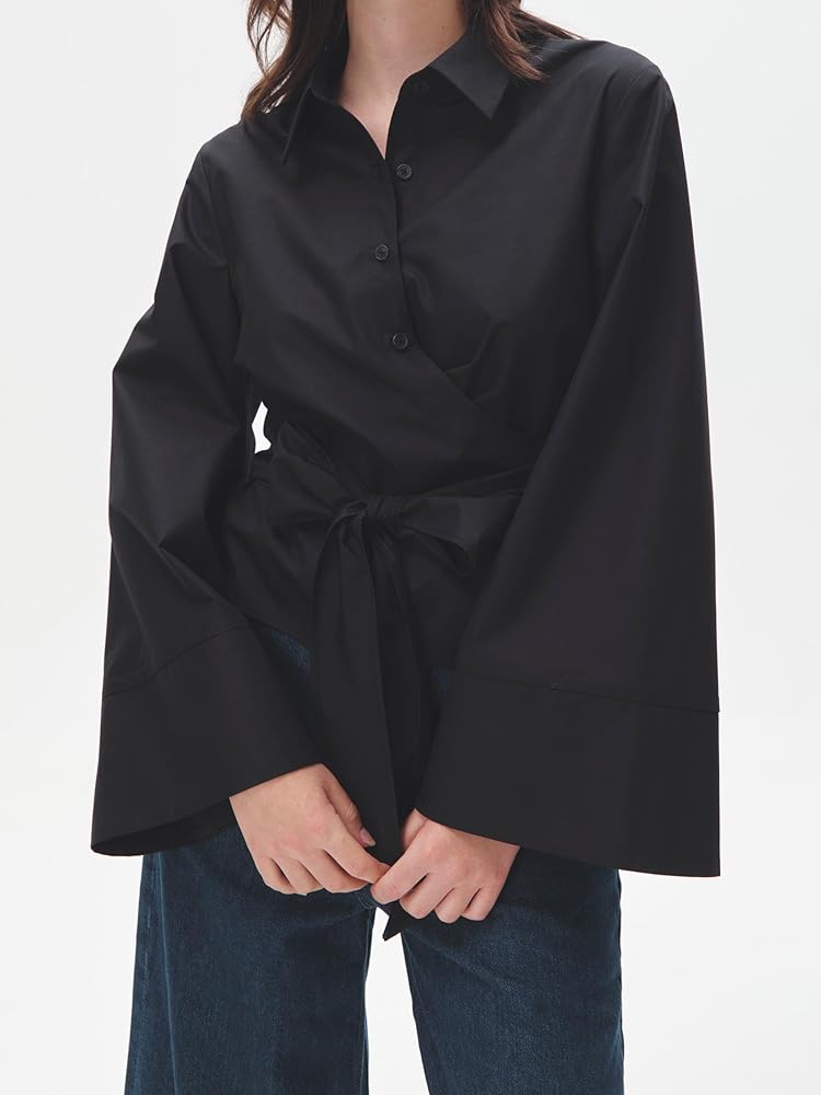This chic double-breasted poplin shirt is tailored for a polished yet playful look. Featuring a stylish polo neck with an elegant bow tie detail, it offers a flattering cropped fit that pairs perfectly with high-waisted pants, skirts, or shorts. The lightweight poplin fabric keeps it crisp and breathable, making it a versatile pick for workdays, evenings out, or casual brunches.